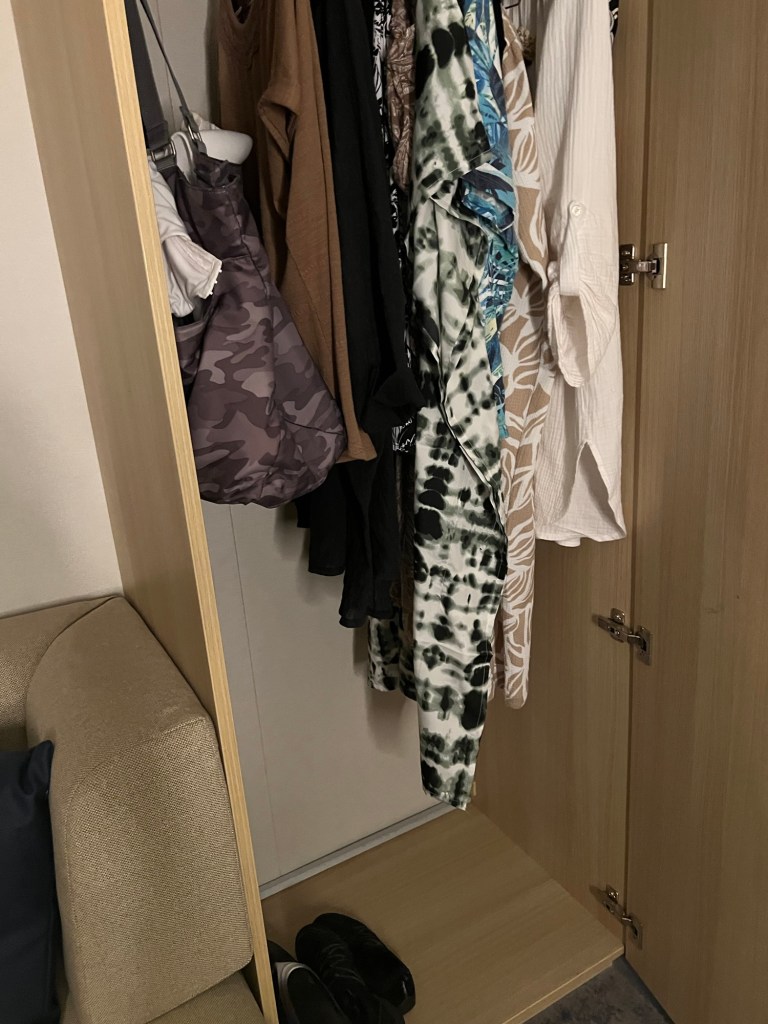 Our room is spacious with a lot of storage, a couch, a mini refrigerator, and a safe. The balcony is large.