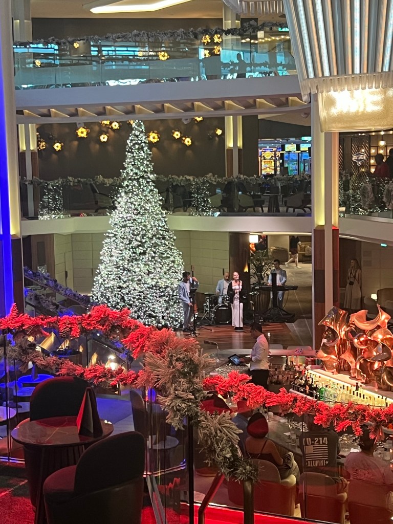 The Reflection is nicely decorated for the holidays with Christmas trees and garland.