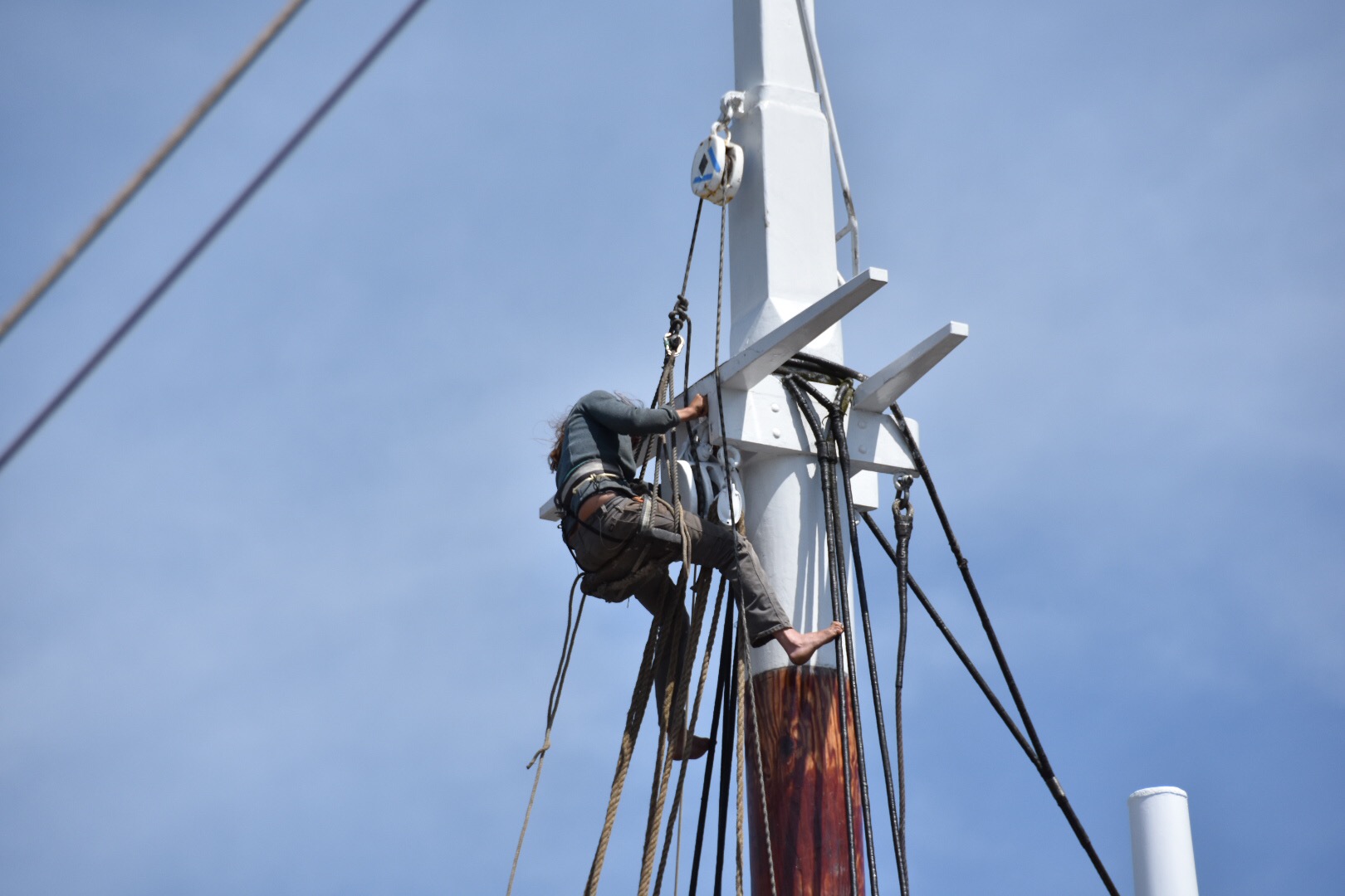 One female crew was hoisted up in a bosun’s chair to work on the mast.
