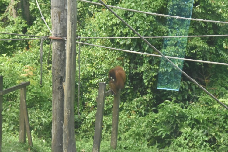 The volunteers work with the orangutans to keep them off the ground. Every time the volunteer came out and put this young juvenile back on the boards, as soon as he walked away, the youngster was back on the ground.