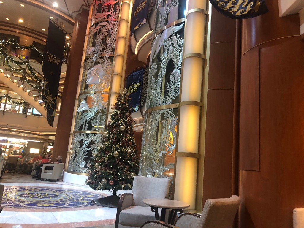 When I get on a ship, I immediately want to explore. I love all the wood finishing and colorful lighting. The Caribbean Princess was decorated for Christmas but that was a bit underwhelming. A tree here and there and some garland but not as much as I would have liked.