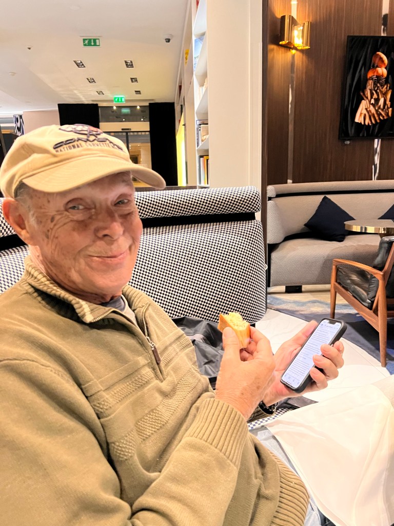 I had my usual coffee with cream and a mango and coconut pavlova. This was sort of like a merengue. Bruce had an apple crumb with ice cream. We shared and both were delicious.