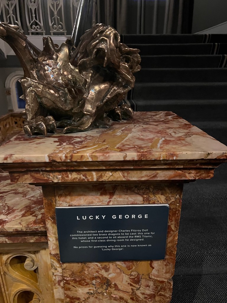 A dragon made of Bronze sits on the bannister at the second floor landing. They call him Lucky George. His twin, placed on the Titanic, was lost at sea.