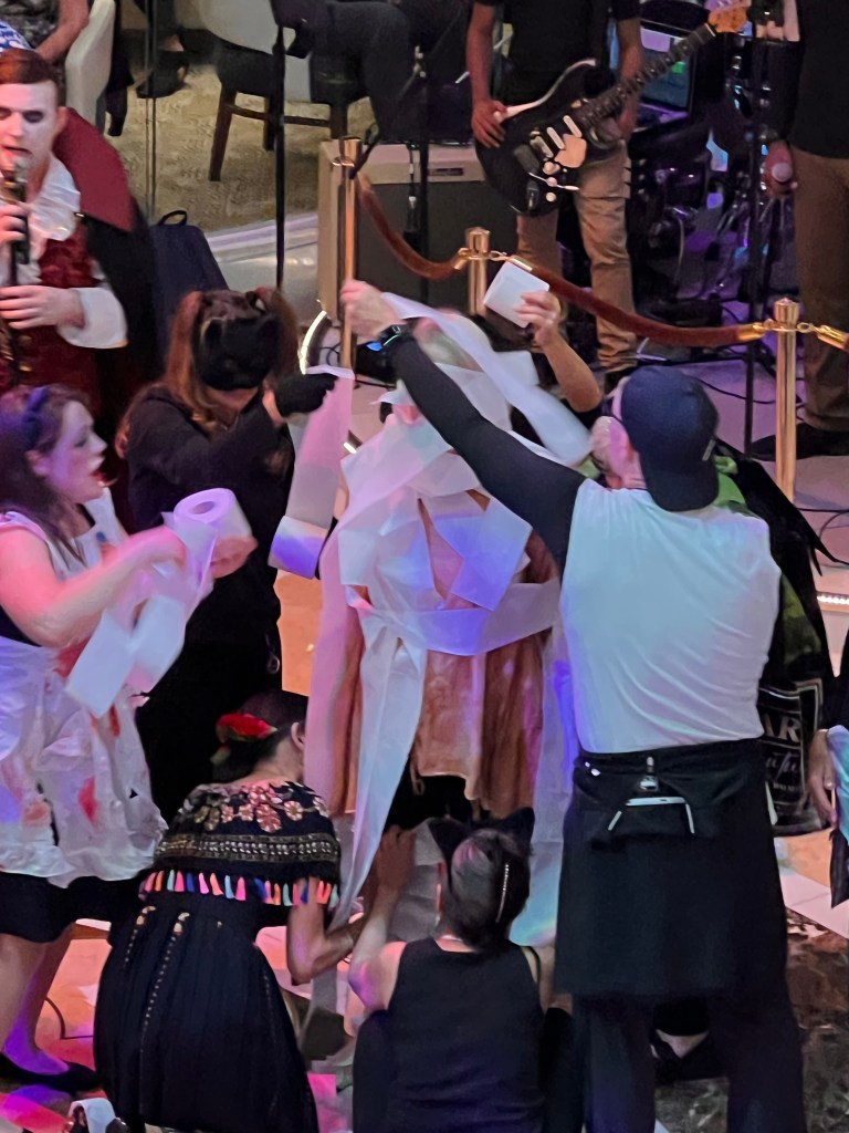 It was a lively crowd even though many were even more senior then us. They had a competition – men vs. women to make a person into a mummy using toilet paper. It was a silly contest and both teams fell short but they gave champagne to both teams.