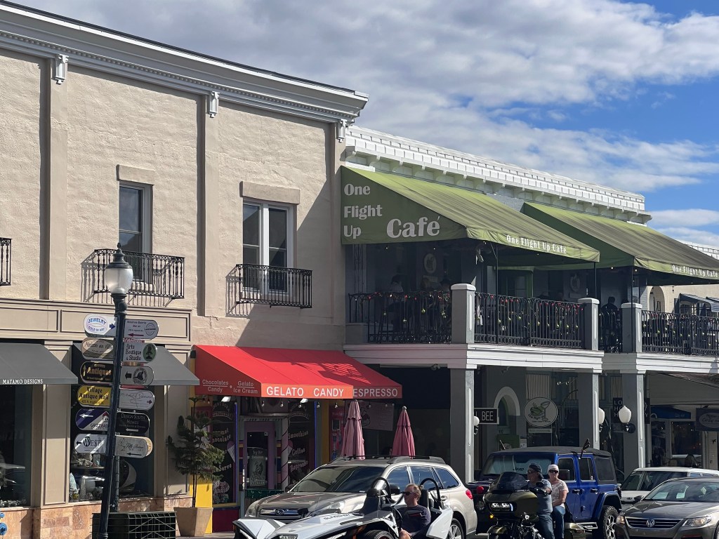 Gift shops line the main street along with restaurants and coffee shops.