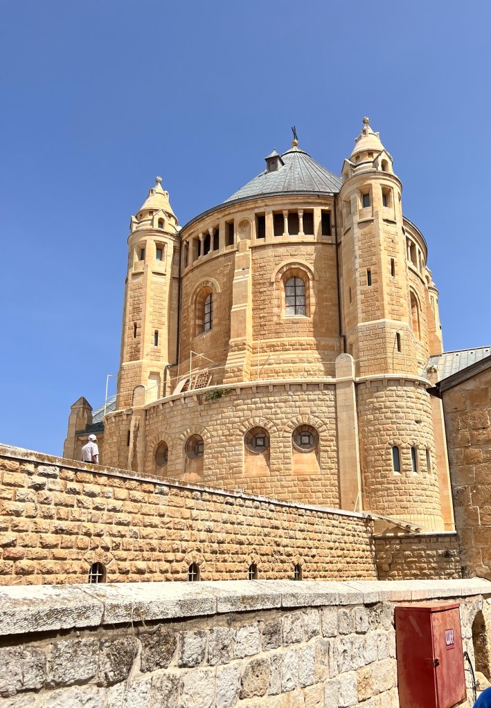 We next traveled to Mount Zion in Jerusalem to The Cenacle, dining room in Latin, which is the upper room traditionally known to be the site of the Last Supper, the final meal Jesus had with his disciples. According to our guide, this is very unlikely and what most likely took place was that Jesus said to look for a man who is carrying a pitcher of water. Since women usually carried the water, the most likely man who carried water would be a monk or Essene Jew like those in Qumran. A sect was within the old city of Jerusalem and that is probably where the last supper was held.