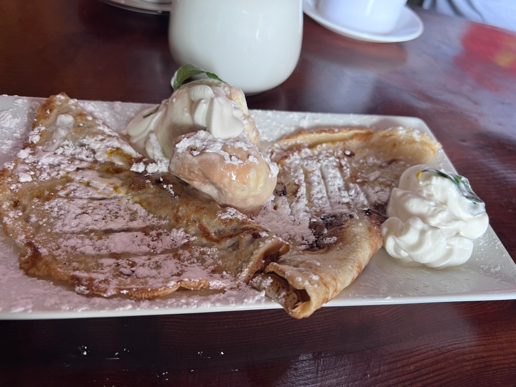 We stopped at a little restaurant, La Surana, for our breakfast. We both had crepes. Mine had fruit and Bruce had ice cream.