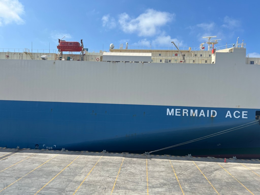 Our view today is not very pretty. All we see is this huge cargo ship. This morning, hundreds of cars were driven off this ship.