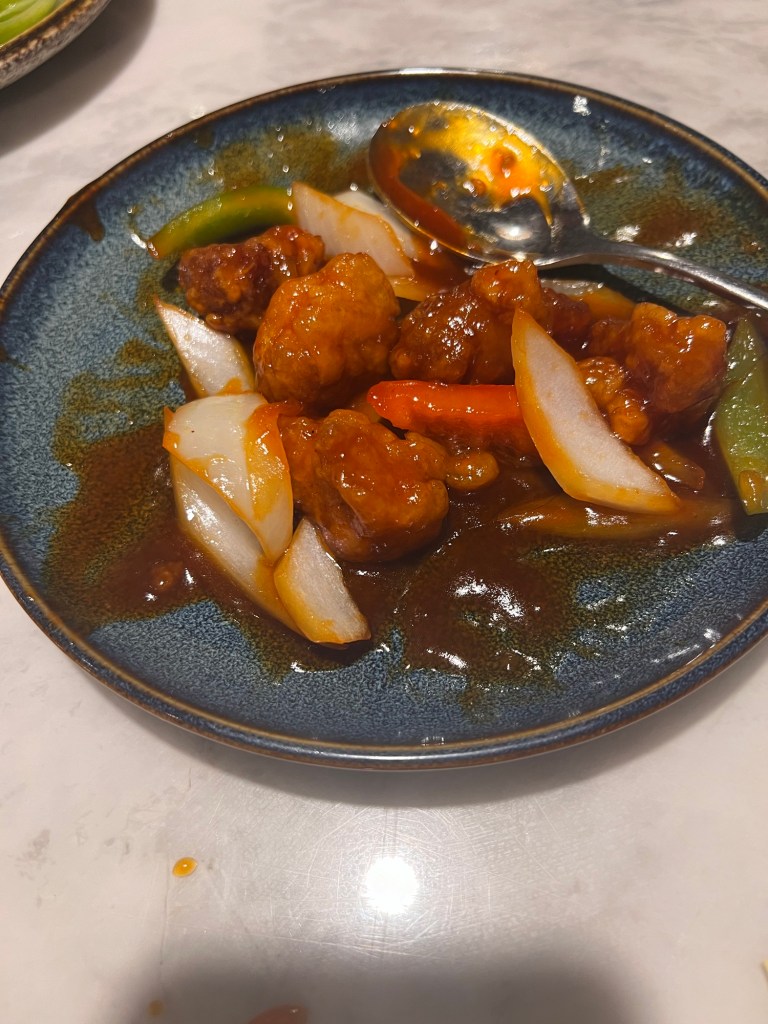 Followed by sweet and sour chicken, fried rice, Chinese vegetables and steak with mushrooms.