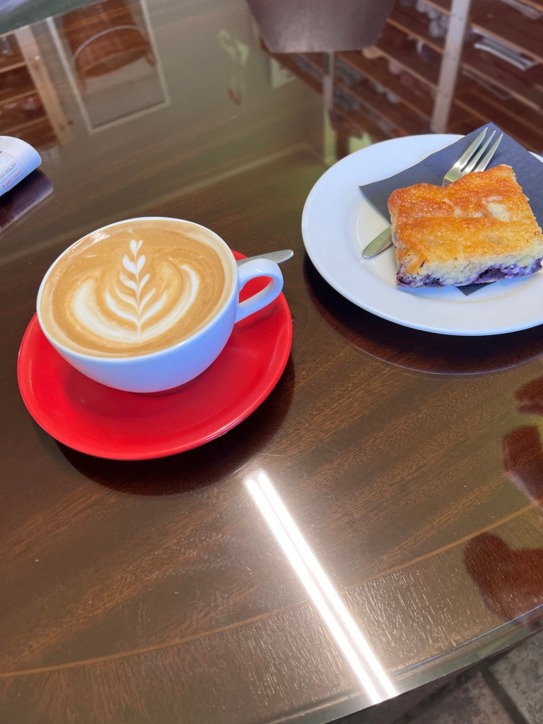 We stopped at a cafe for cappuccino and cake. We sat in a room that was a craft room.