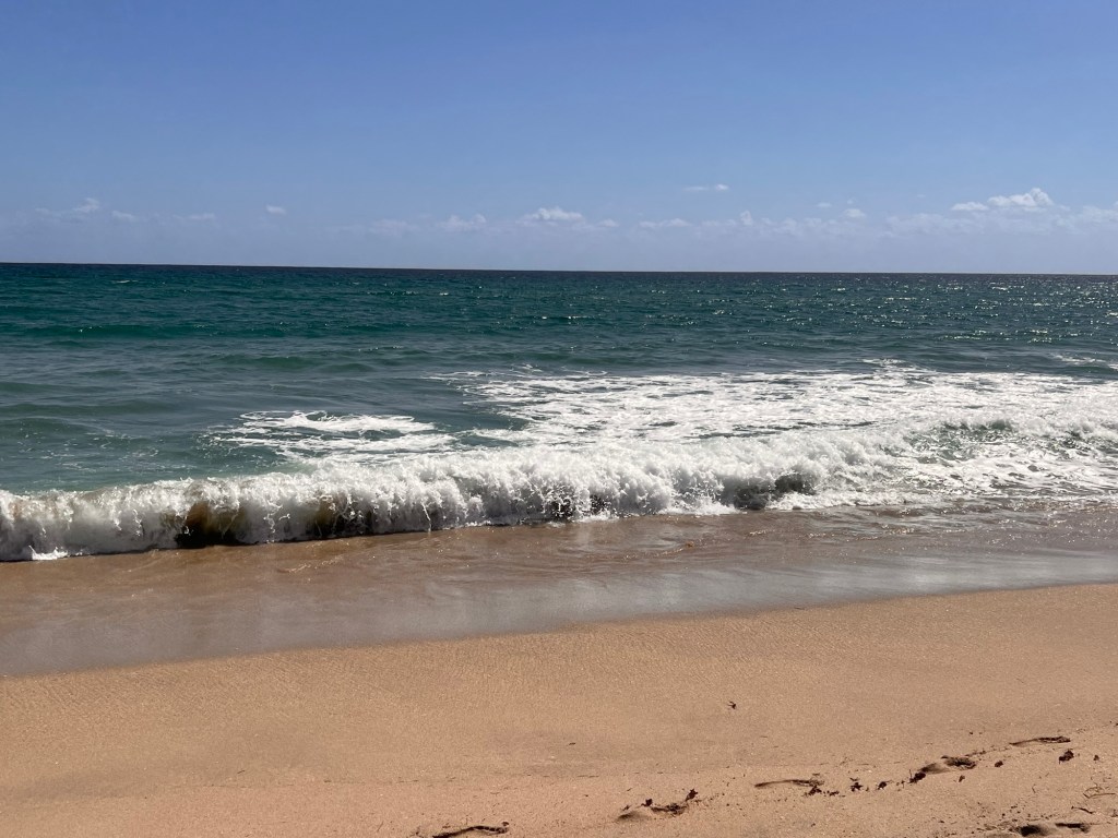The water is clear and you can see your feet in six feet of water. Sometimes it’s calm and sometimes there are waves. My husband loves to boogey board.