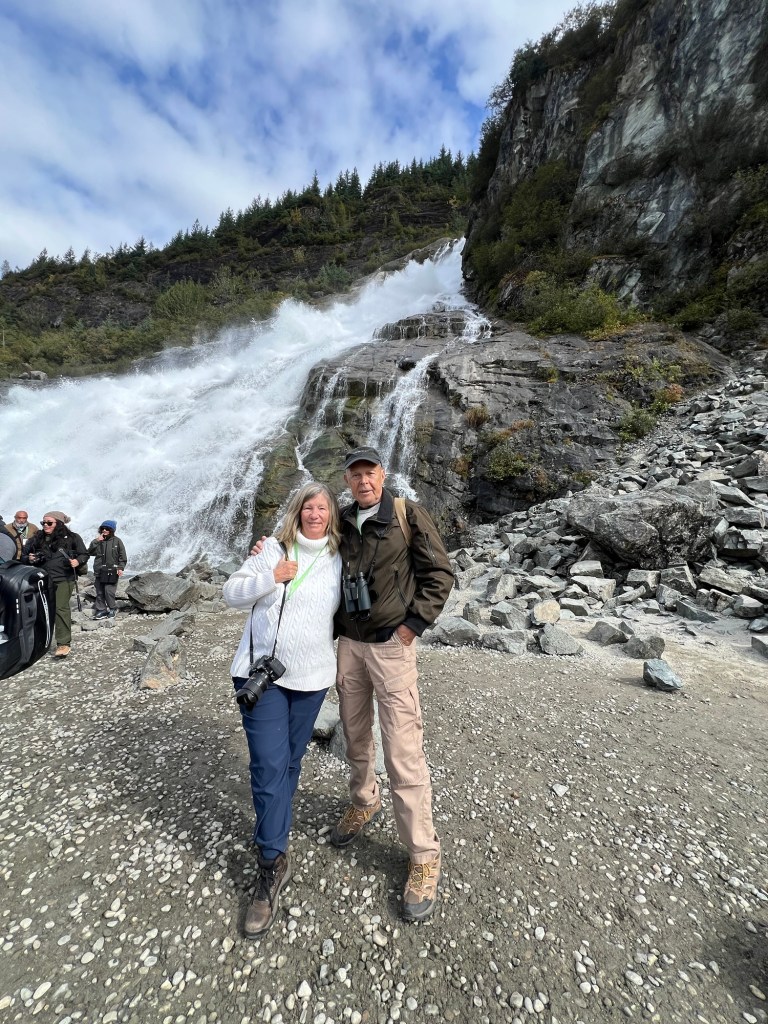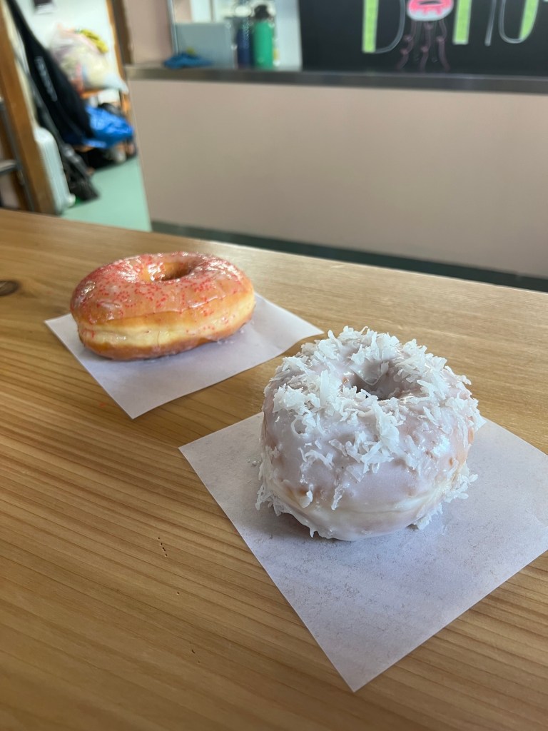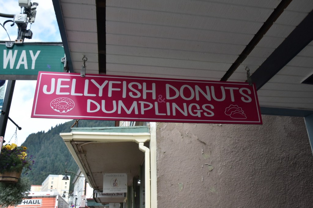 Bruce and I headed out in our hiking gear. Our goal was to go to the Mendenhall glacier and take a hike to Nugget Falls. But first, we stopped at Jellyfish Donuts for some sustenance. I had a coconut cream donut and Bruce had an Alaskan strawberry rhubarb.
