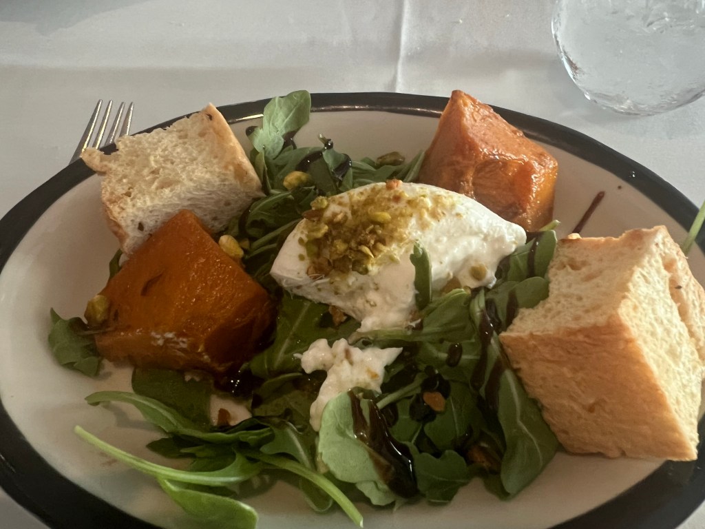 We had a lovely dinner in Tuscany. There are four main dining rooms: Tuscan, Normandy, Cyprus, and Cosmopolitan. We can eat in any one of these. I had escargot, a pumpkin salad, and prime rib. With a cannoli for dessert.