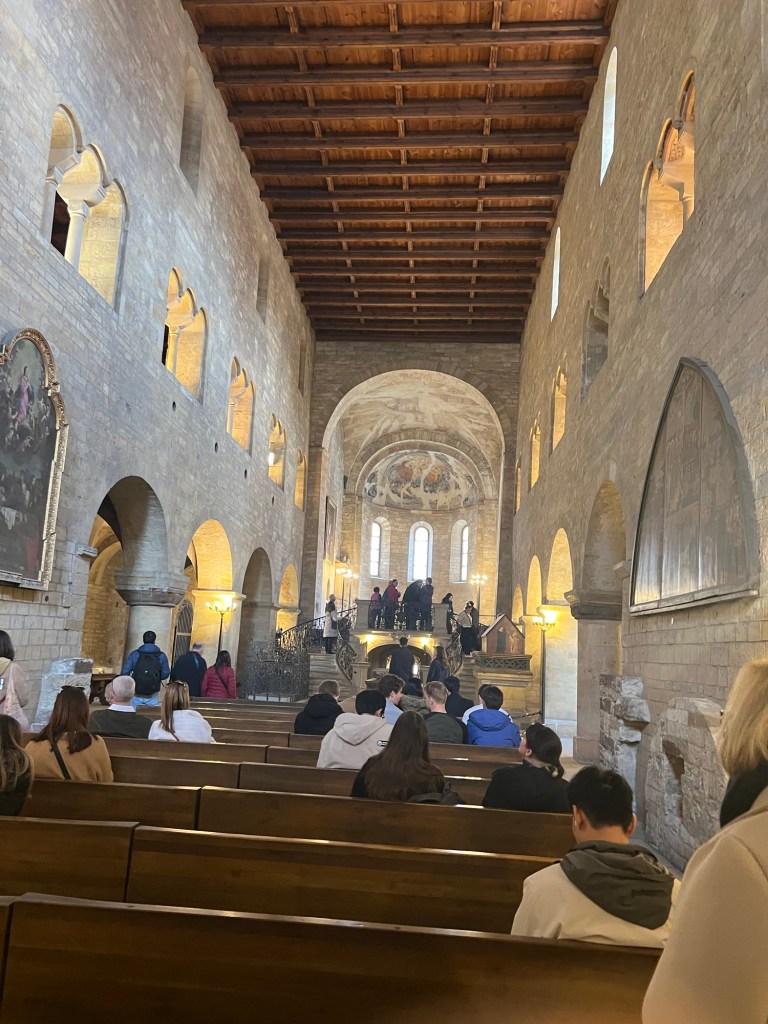 The stained glass inside the cathedral was beautiful.