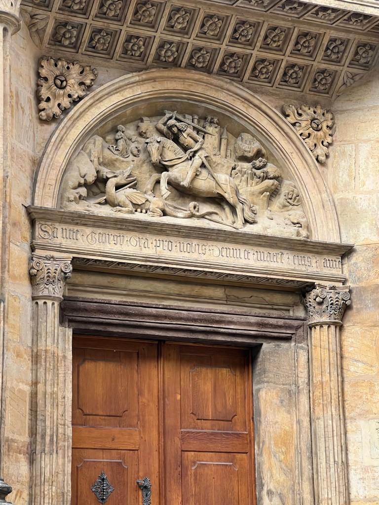 The side of the building has a sculpture of St. George and the dragon.