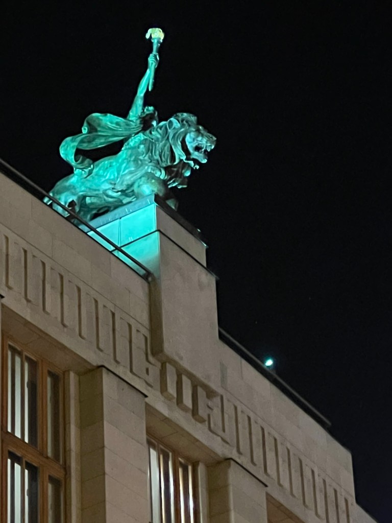 And some large lion sculpture on top of a building.