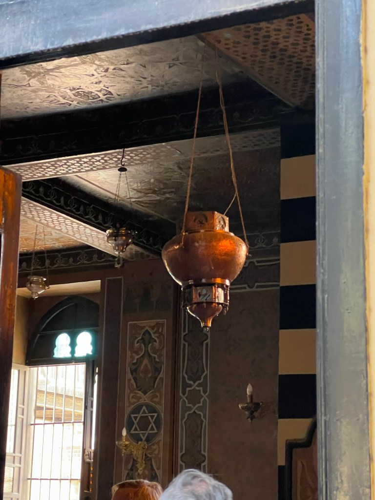 Unfortunately, photos were not allowed so this was the only one from the door. Inside it was decorated with beautifully crafted patterns and inlaid reliefs similar to the Coptic churches but with Menorahs instead of crosses.