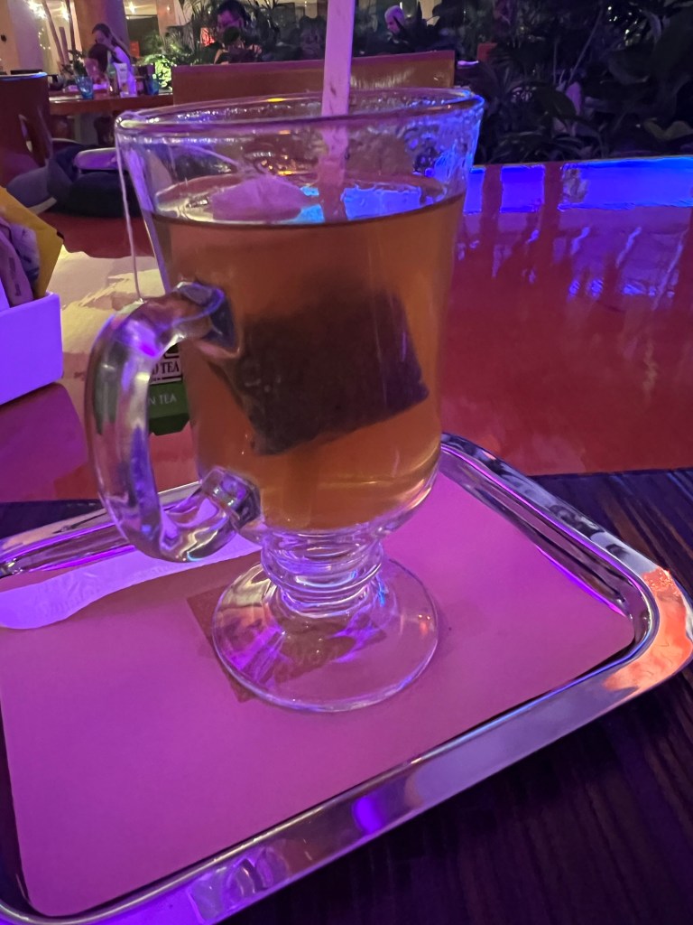 We went through security. Actually in all of Egypt it seemed we’d go through two security checks. Total time was less than 40 minutes and then a few to find a lounge. We ate dinner with dessert.