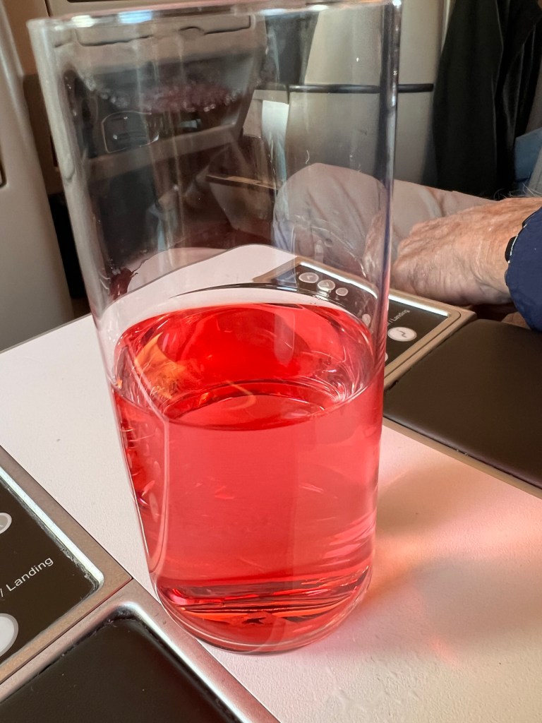 The flight attendant offered champagne but we had Elderberry juice that had no alcohol.