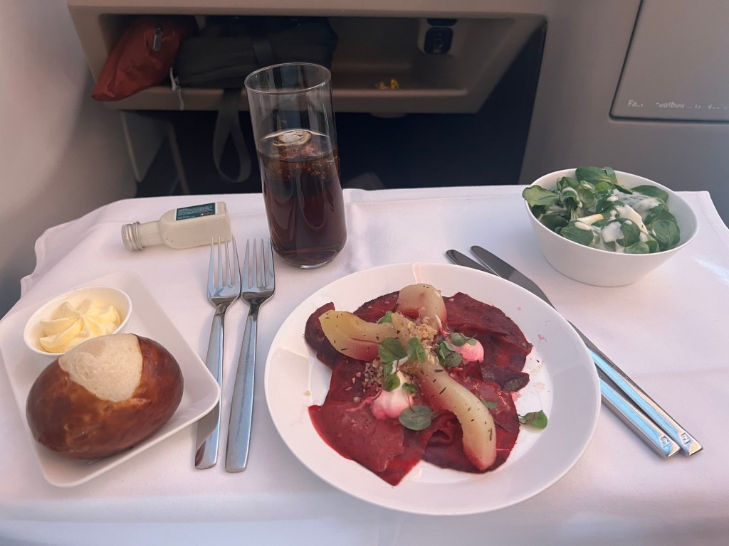 Our first leg was traveling in business class on Swiss Air to Zurich. We ate our meals on board. I had chicken with polenta and cabbage. Bruce had beef stroganoff. Tasty.