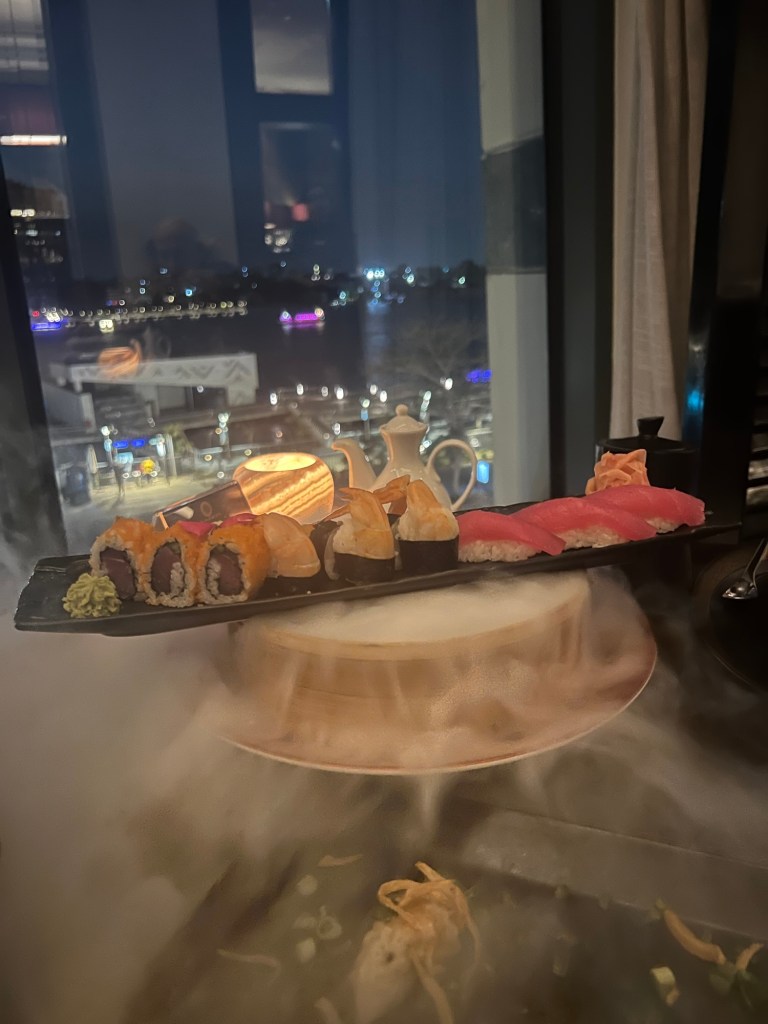 Our dinner was served on linen tablecloths or more like a linen napkin. We had salmon and avocado for an appetizer and I had some beef dish for the main course.
