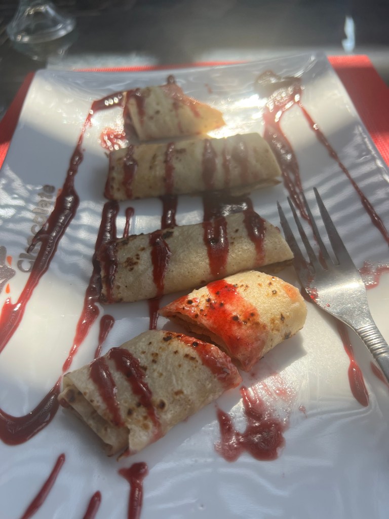 Bruce and I had some water, a mango smoothie, and a crepe as we waited to board our bus.